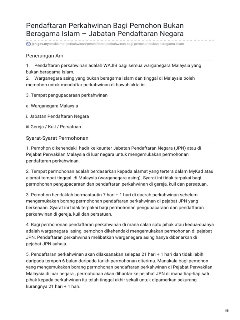 Pemohon hendaklah bermastautin 7 hari 1 hari di daerah perkahwinan sebelum mengemukakan borang permohonan pendaftaran perkahwinan di pejabat JPN yang berkenaan. Pemohon perlu mengemukakan permohonan pendaftaran perkahwinan di. Perakuan Permohonan Perkahwinan Khas Bukan Islam bermaksud untuk meluluskan perkahwinan mengikut Akta Membaharui Undang-Undang Perkahwinan dan Perceraian 1976 Akta 164 dan Kaedah-kaedah Seksyen 21 1 tanpa memerlukan pemberitahuan perkahwinan dan memberi kebenaran kepada Pendaftar Perkahwinan untuk mengupacarakan perkahwian.